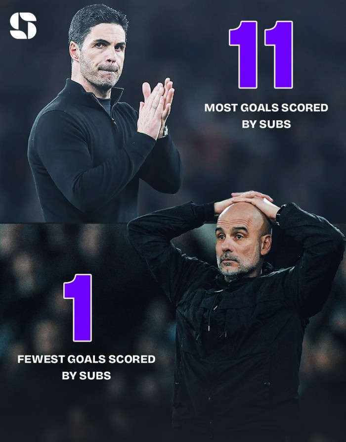 据统计,阿森纳本赛季在英超由替补球员已经打进11粒进球,此数据为所有球队最多,而曼城则只利用替补球员打进1球,为所有球队最少。